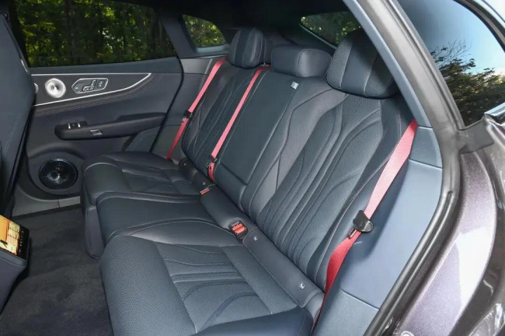车身侧面造型平滑,前后突出的翼子板和门板上隆起的筋线展现出力量感。车身十分修长,姿态低趴,继续采用无框车门和隐藏式电动门把手。车尾顶部有波浪形扰流板,贯穿式LED灯组内部模块排列整齐,后包围与前包围相呼应,层次感丰富。长宽高分别为4977*1999*1545毫米,轴距为3005毫米。