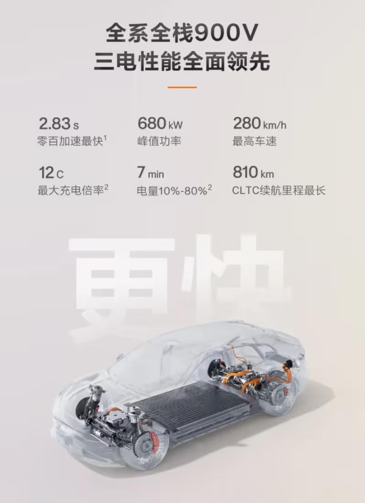 焕新极氪001全系全栈900V,零百加速最快2.83s,峰值功率可达680kW,CLTC最长续航里程810km。支持12C最大充电倍率,电量从10%充至80%仅需7分钟。新车配备闭式双腔空气悬架,最大离地间隙206mm,最大调节行程85mm。全系标配CCD电磁减振系统、智能魔毯功能和定海智能中枢。